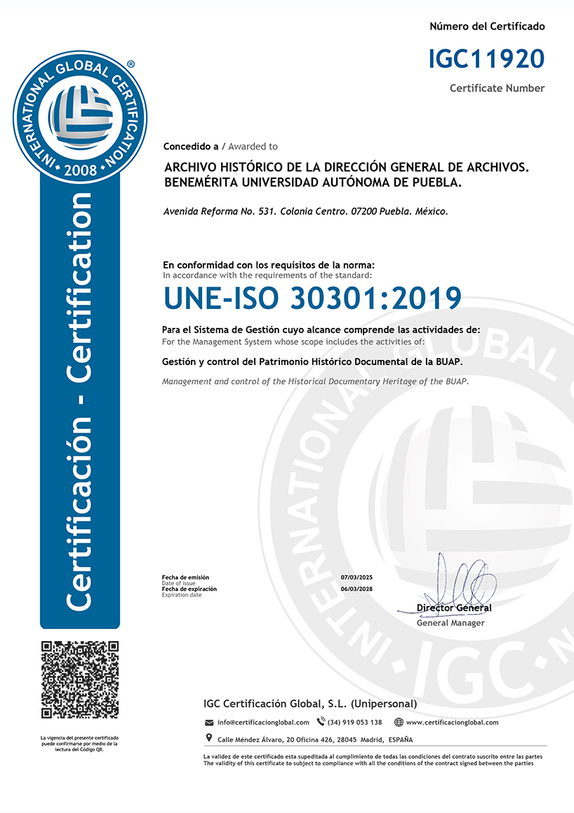 Como parte de los procesos de mejora y calidad, el Archivo Histórico Universitario de la BUAP recibió la certificación de la Norma ISO 30301:2011, que avala la gestión documental de su acervo, tanto en papel como en formato electrónico. Con ello, se convirtió en el primero de América Latina en recibir esta acreditación.